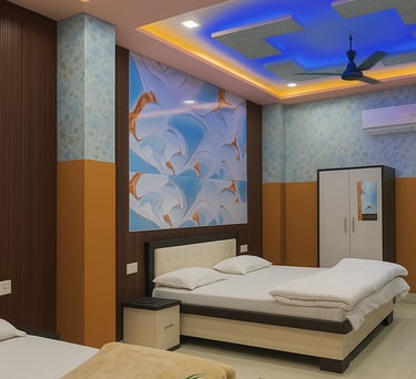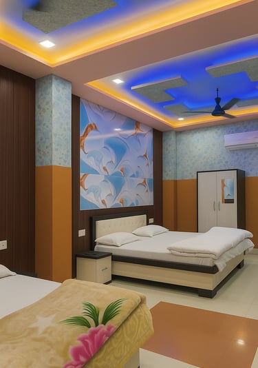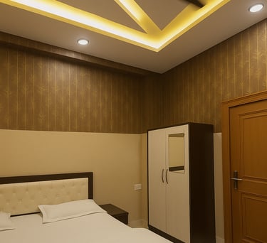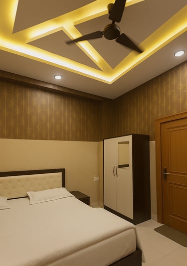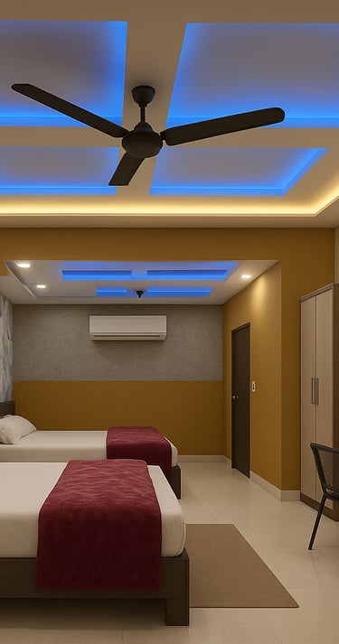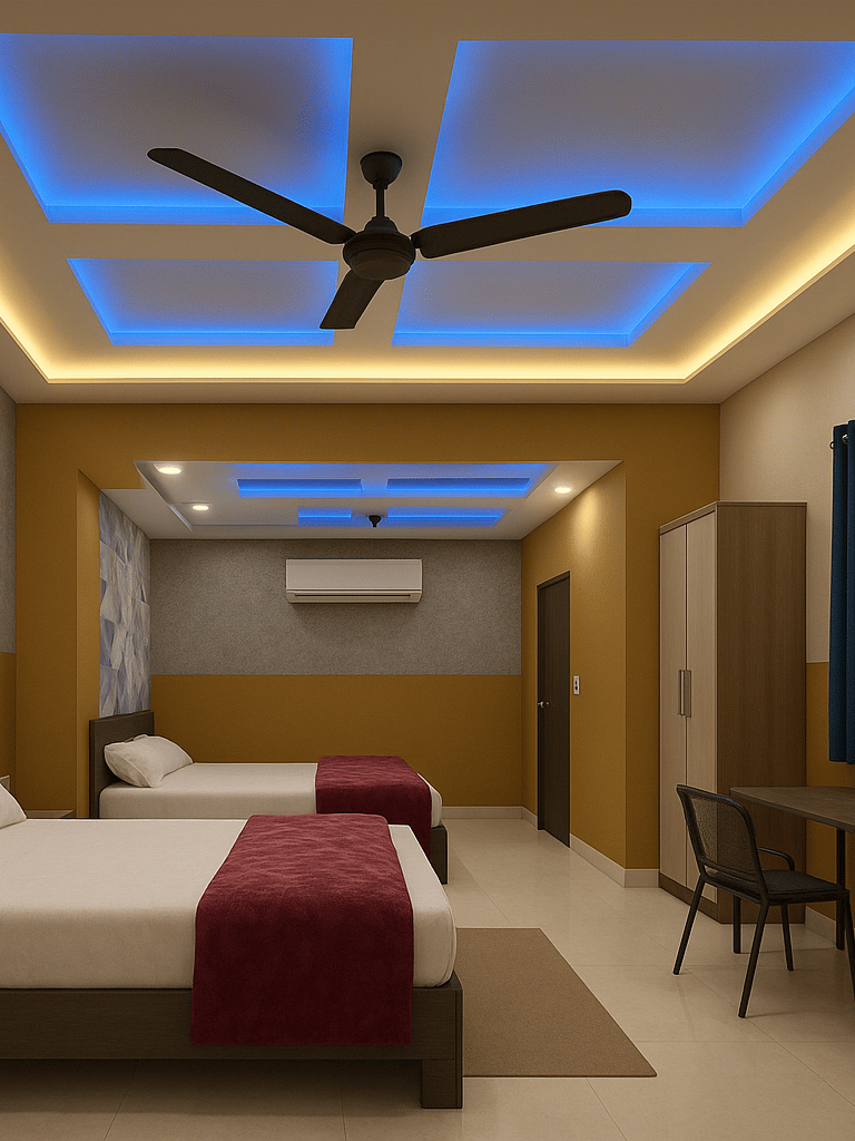 Our Deluxe Comfort Room features warm ambient lighting, stylish ceiling décor with soothing blue tones, and modern furnishing designed for ultimate relaxation.